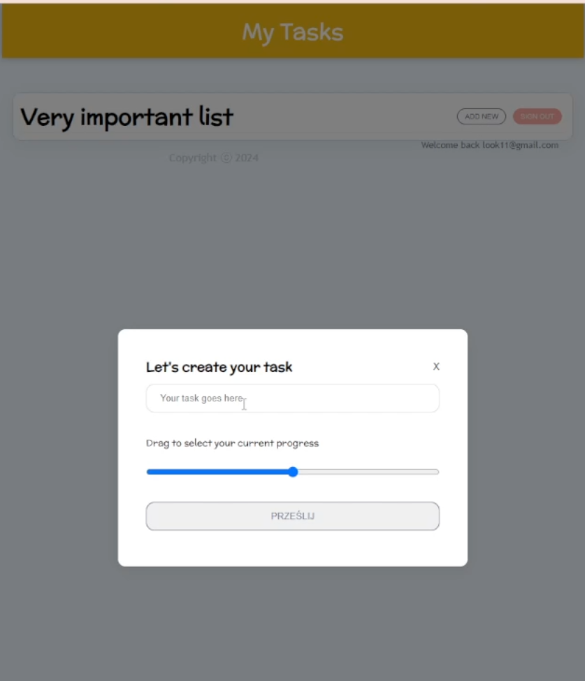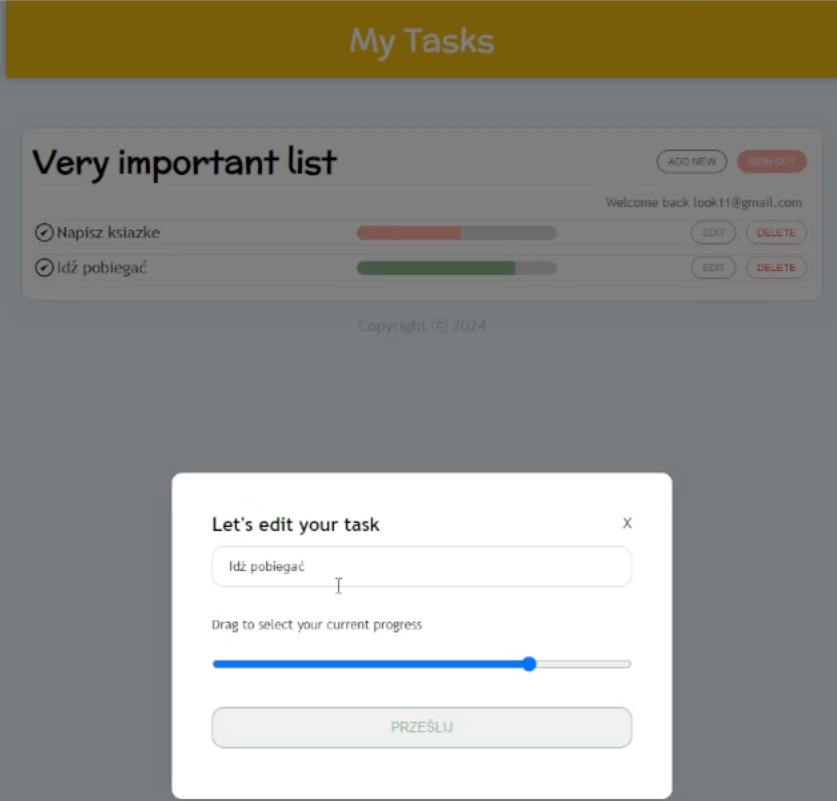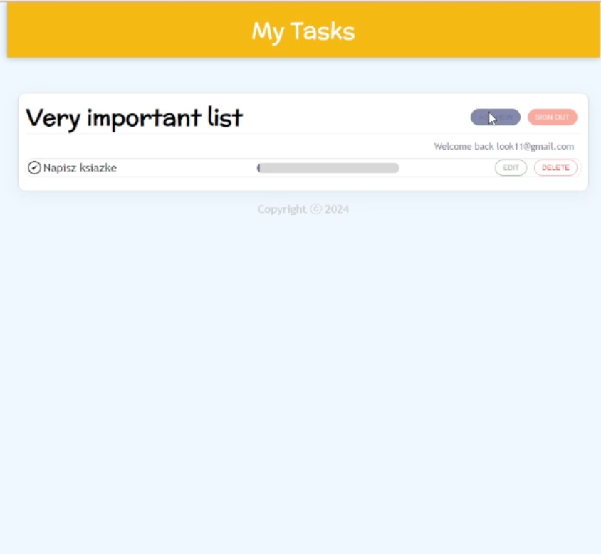Aplikacja webowa służąca do robienia listy zadań. Posiada funkcjonalność rejestracji użytkownika, dodawania zadań i ich edycji z uwzględnieniem postępu. Przypisuje do każdego sobnego konta zadania za pomocą bazy danych PostgreSQL